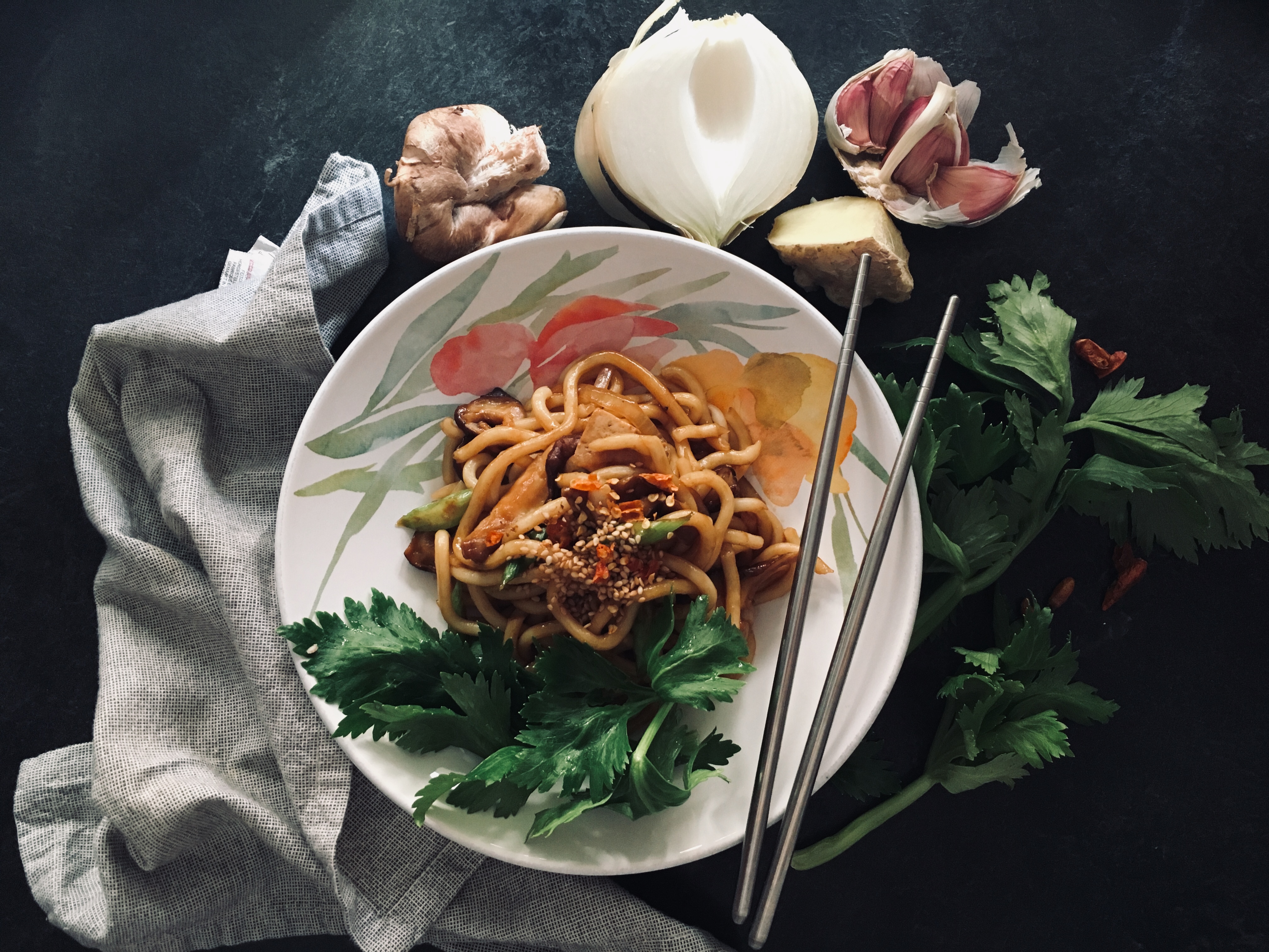 - Put in the udon mushroom and all the sauce in (vegetarian stir fry sauce, sweet soy sauce, bouillon, liquid smoke) stirred it well, lastly put in the celery stalk and smoke tofu, continue to cooked until the sauce coating the udon well.