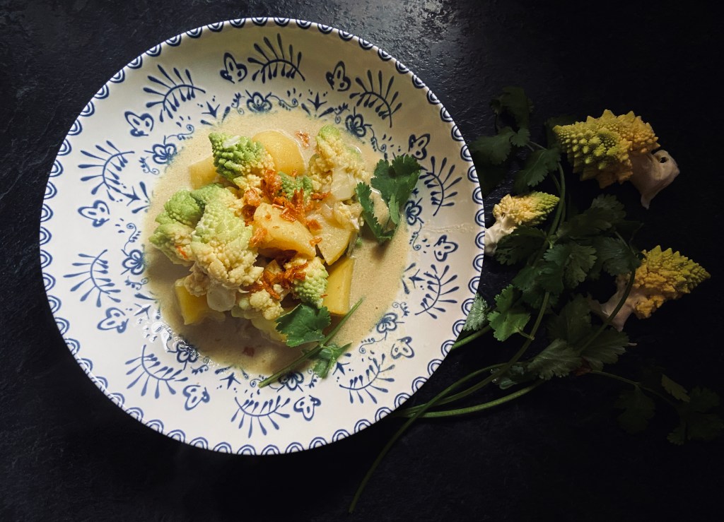 In here, because I have fresh cilantro. I look for possibility on my fridge, only have half of Romanesco and I know I have potatoes somewhere. So I know what I want, Indian style curry, with spices from the bottle, trying to keep it simple.