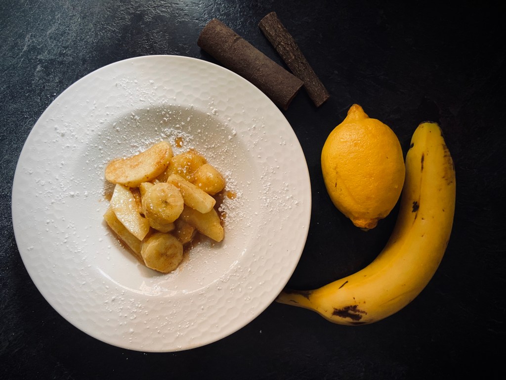 I love cinnamon, I love lemon, banana and apple, ingredient that direct me into leisure breakfast. but it was passing breakfast time, even was late in afternoon. But I want to had quality afternoon with quality snack. As food are become super precious during quarantine time in Madrid (because of pandemic of course), something as little as leftover bites are precious to me too.