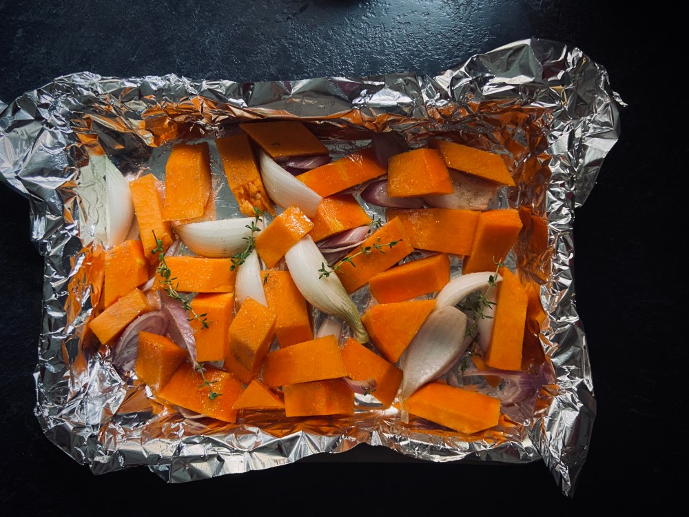 This recipe is only enough for two, but surely you could just pick up similar ingredient like mine. If you asked me, where the cheesy flavour come from, the answer is I don’t know exactly from which ingredient, I think maybe come from the roasted pumpkin, because the seasoning is minimal and super basic, but instead of using onion, I used the bulb of spring onion, also mixing it up with shallot, garlic, and thyme for suave, mild flavour. If you are in mood from something stronger, you can used rosemary, just used very little amount of it, just to infuse the soup, because. this is only my opinion, bunch of rosemary are taste like soap hehe, unless you using it to seasoned your steak.