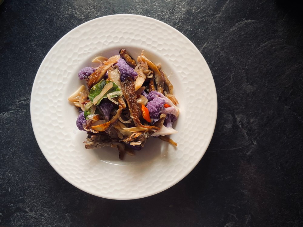 - When mushroom exterior are turned golden, put inside the cauliflower, sea salt and pepper, stirring through and give it a taste, corrected accordingly.