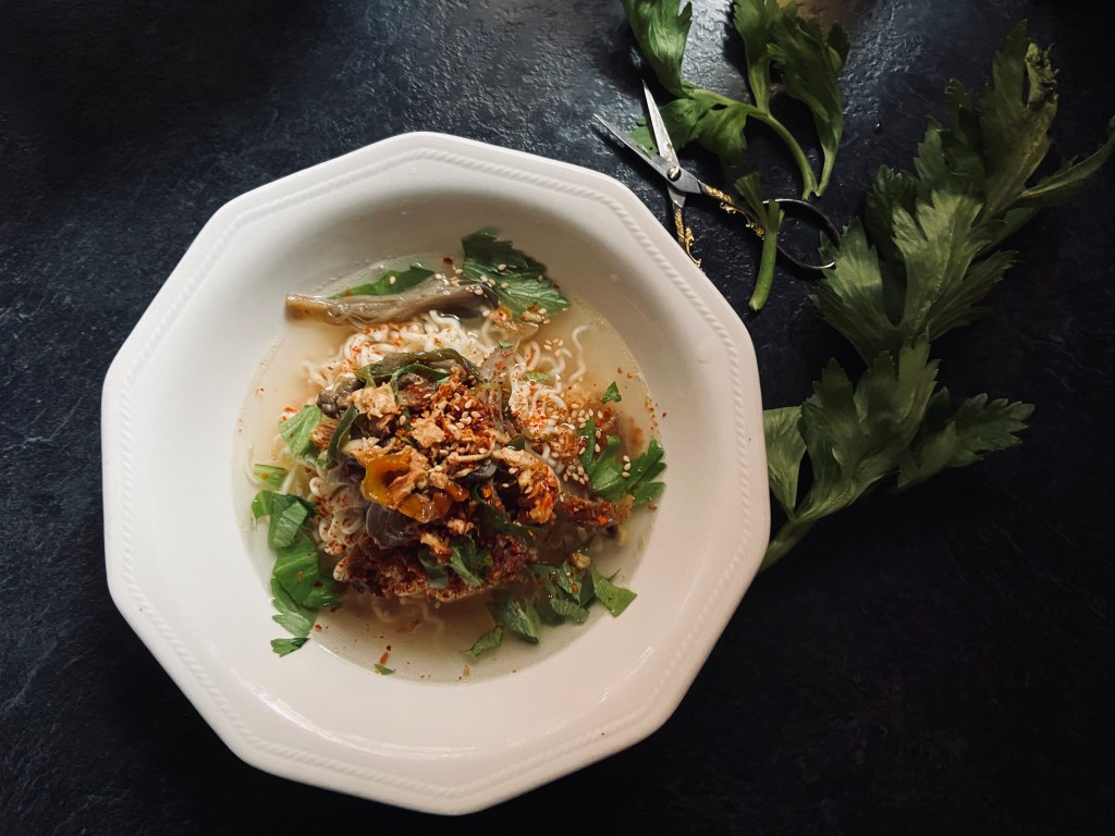 This are very quick easy version, only if the ingredient are in hand, I know what it sound, sound like trap advertising hehe. But if you have it all in hand, the noodle are will be ready in no time. Also just few ingredient needed. By few are golden garlic, vegetable stock, sea salt and pepper, also noodle of course hehe. But since I have leftover mushroom stir fried, I have it as my topping. But if you don’t have it you can have it just as it is. My kids have this noodle soup with boiled egg and a lot of fried onion. You also able to have it that way.