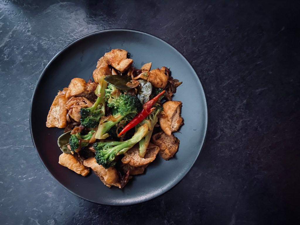 - When the basic seasoning are fragrance, put inside the tofu and broccoli, as well as the vegetarian sauce, sweet soy sauce and pepper. Stir it through, then give it a taste, only add the extra salt if you think you need it, since most of the sauce are salty.