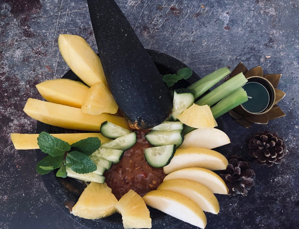 - Grind all the sauce ingredient in pestle and mortal until soft, then ready to be enjoy directly with the slice fruit.